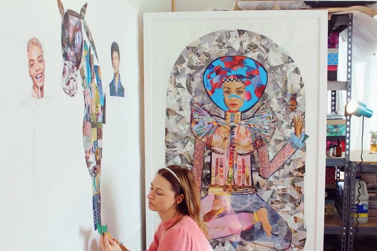 I create large conceptual collages by using fashion magazines in their entirety, page by page. I use something - a color, a shape - off every page of a single magazine or magazine subscription to create a unified artwork.