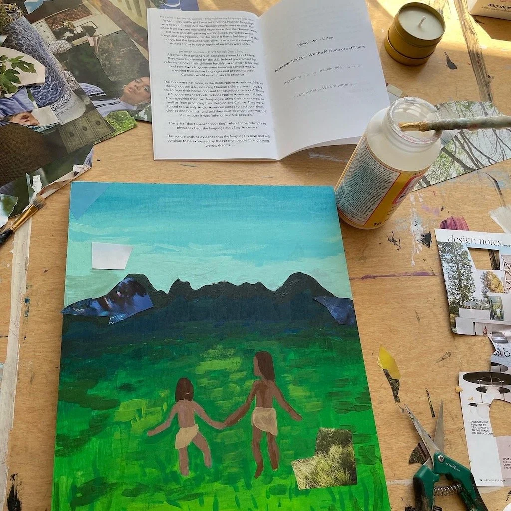 I am grateful to Shelly Covert and the entire Nisenan Tribe for educating and trusting me to create this artwork. Thank you to Curator Mira Clark for your facilitation and friendship. Thank you Ember for inspiring me to get involved. Thank you Kit Kohler for photographing the collage workshop. Thank you in advance to everyone who attends the "Visibility Through Art " show and supports this initiative. Thank you to this land, we are proud to call home.