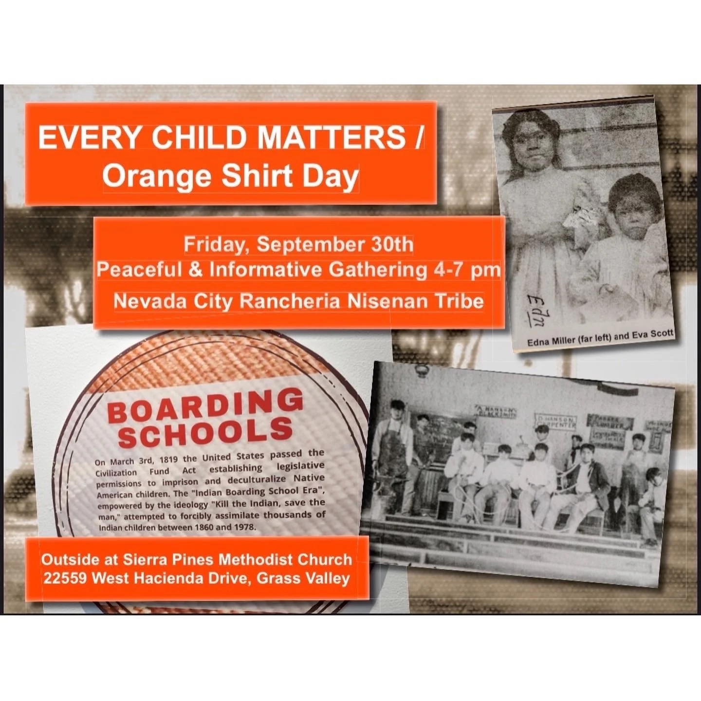 On September 30, we honor the children forced to go to the Boarding Schools. Every Child Matters or Orange Shirt Day, is a National day for truth and reconcilation. It will be observed here in Grass Valley and all are invited to attend peacefully. See flier…