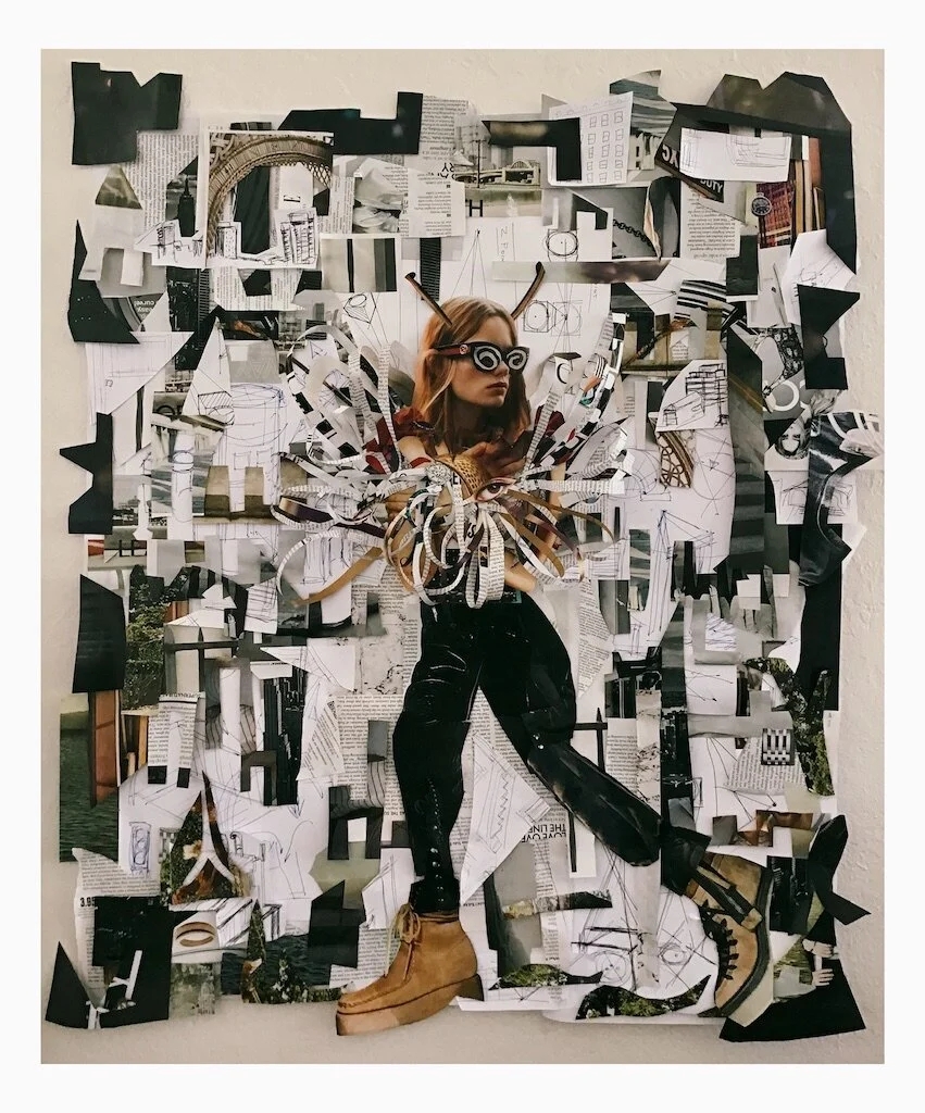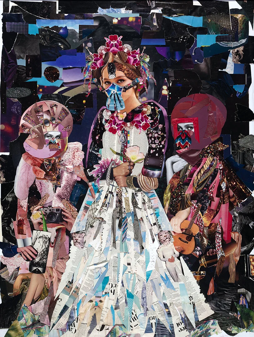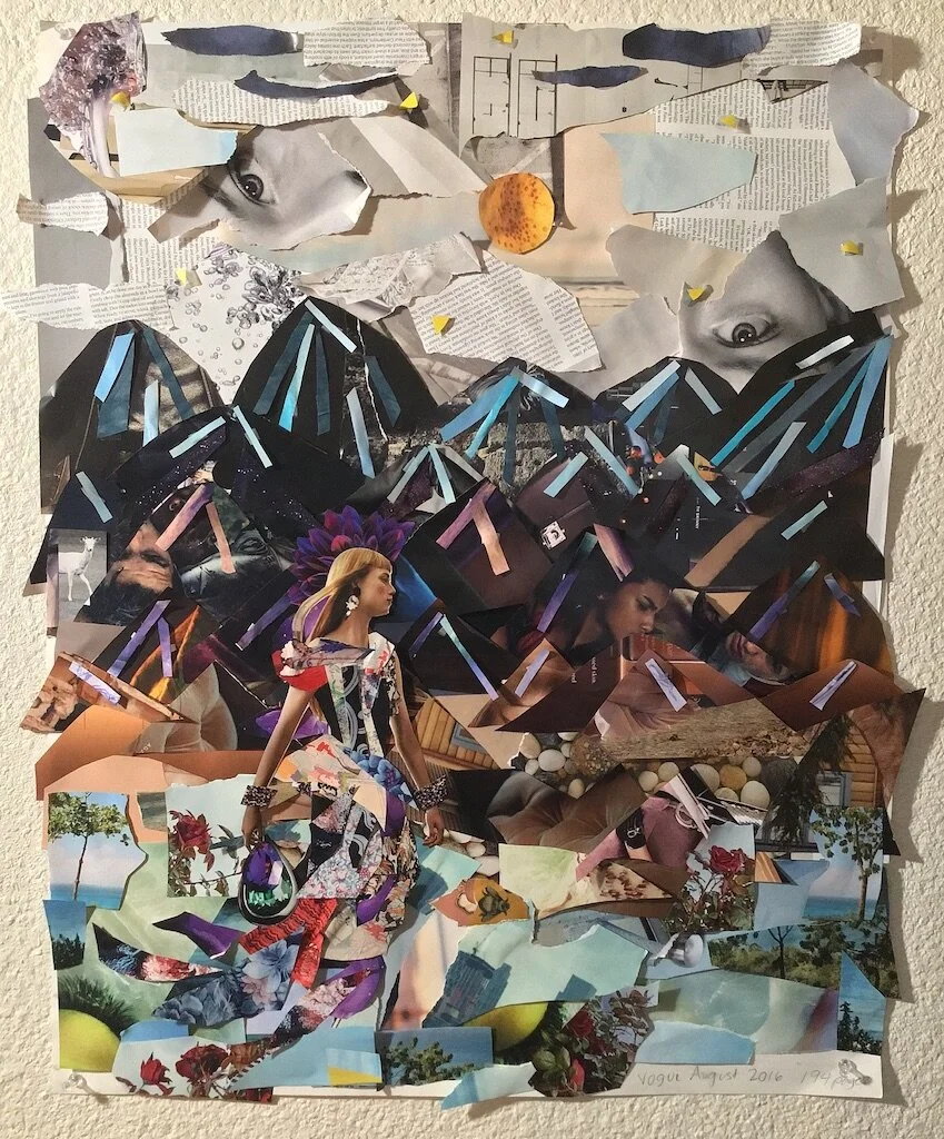 View fullsize  Onward Adventurina  2019  18x24”  Created using something off every page of the August 2016 Vogue Magazine, 194 pages.  Sold