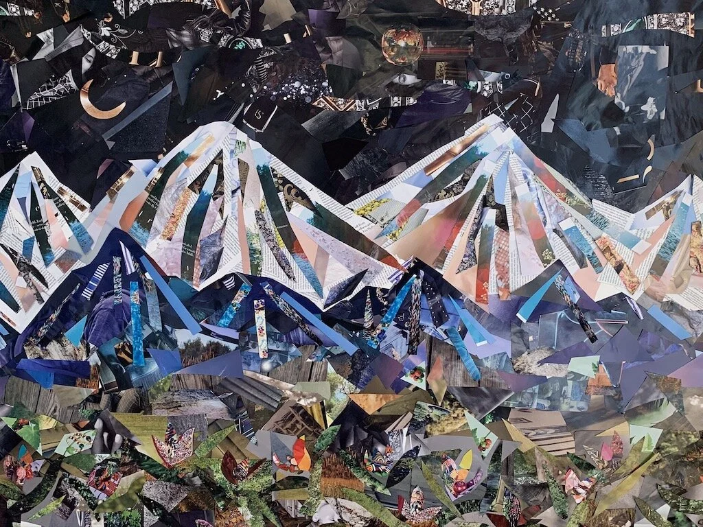 View fullsize  Mountain Place  2020  5x3’  Created using something off every page of the October 2016 Vogue Magazine, 316 pages.  Sold