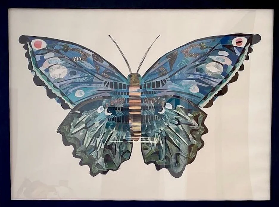 View fullsize  Butterfly  2021  29x39” Framed  Created using something off every page of the Summer 2020 Surfer Magazine, 84 pages.  Sold